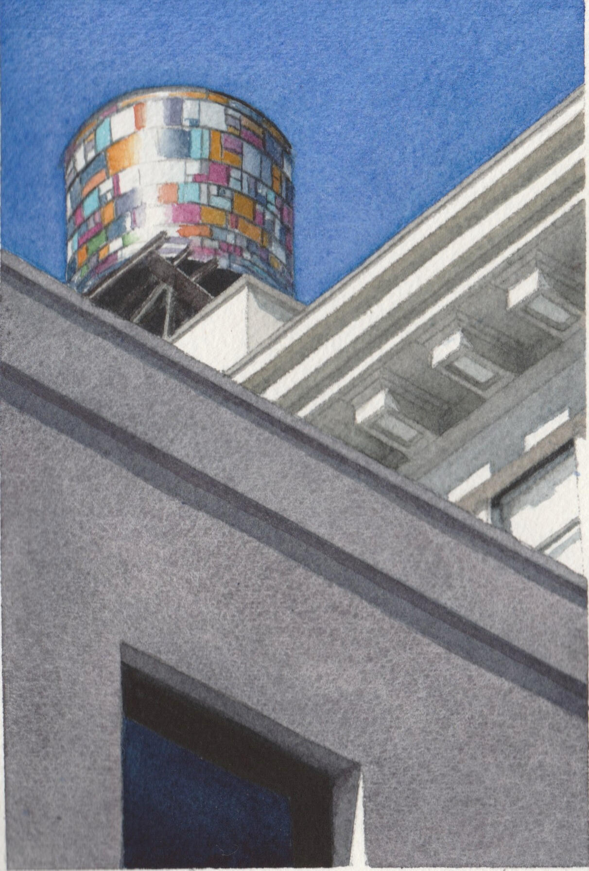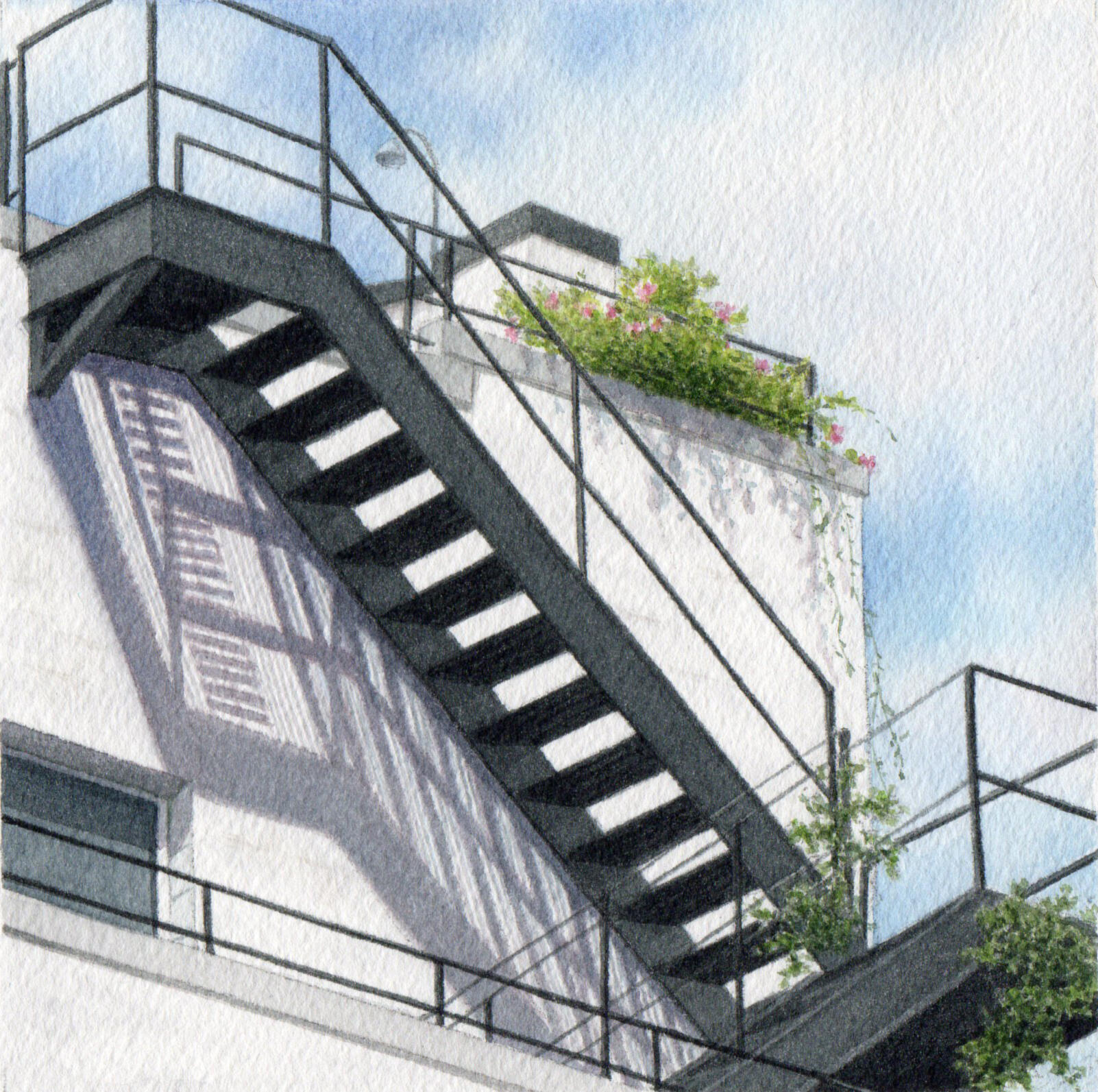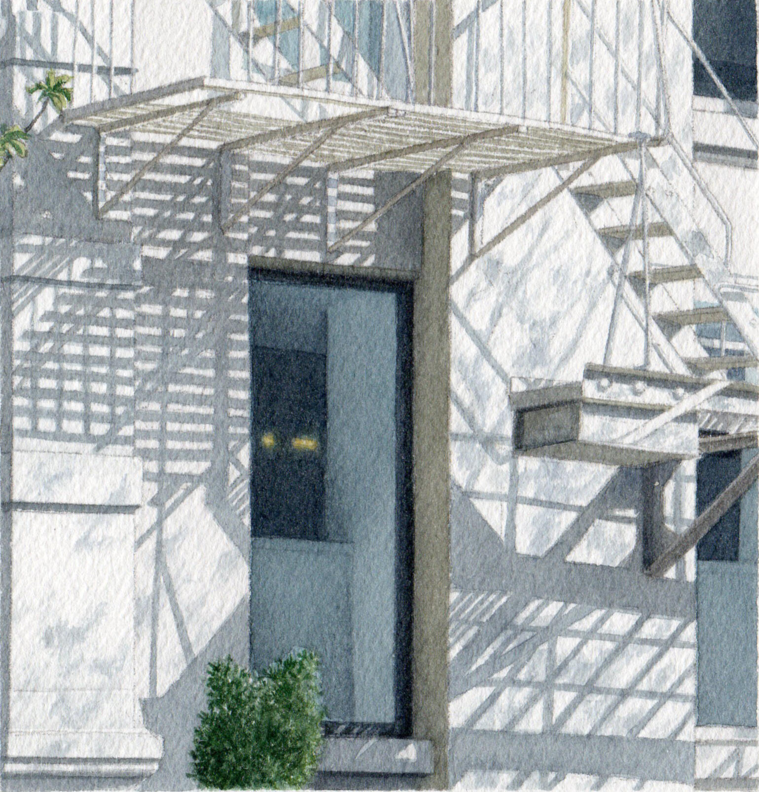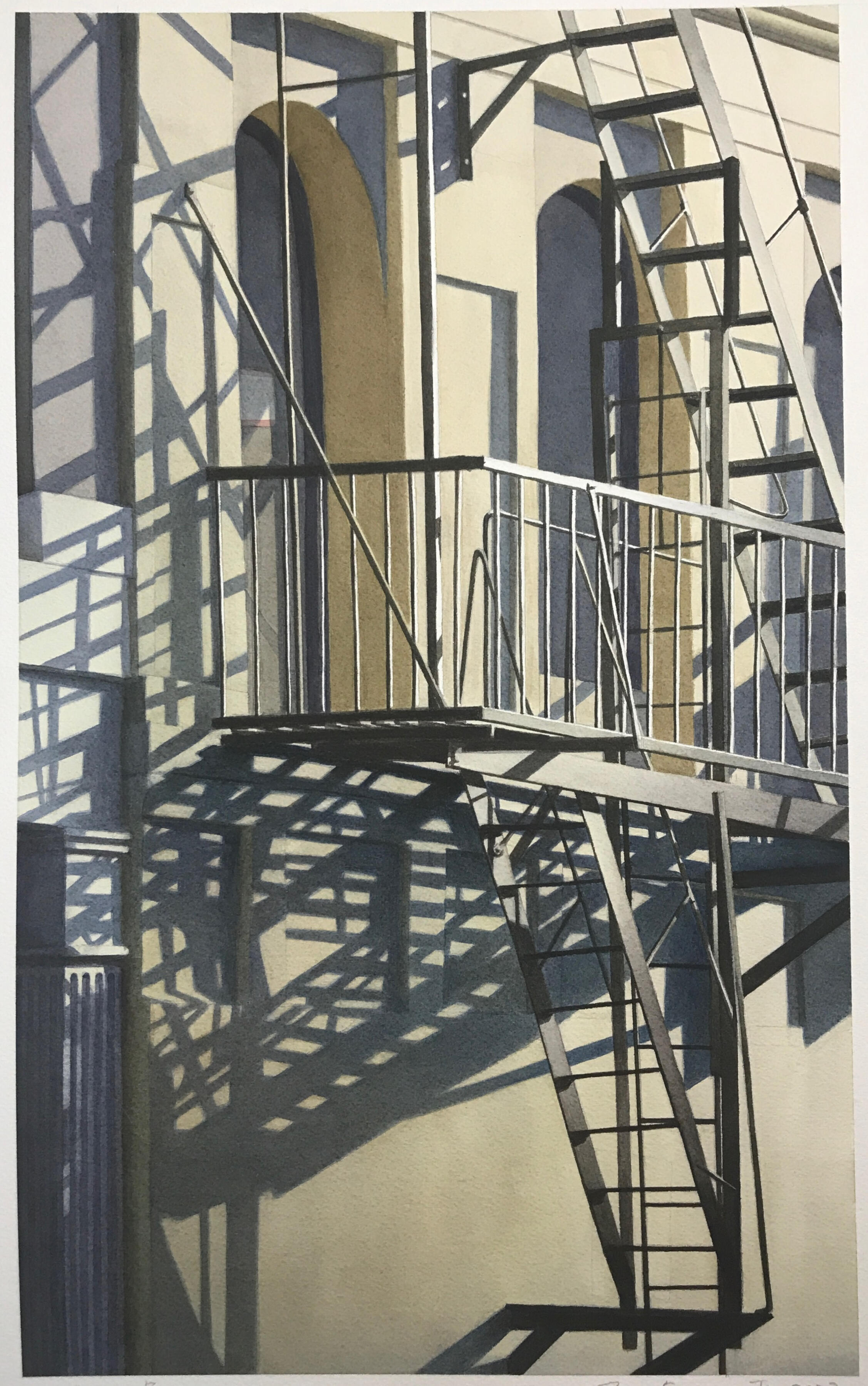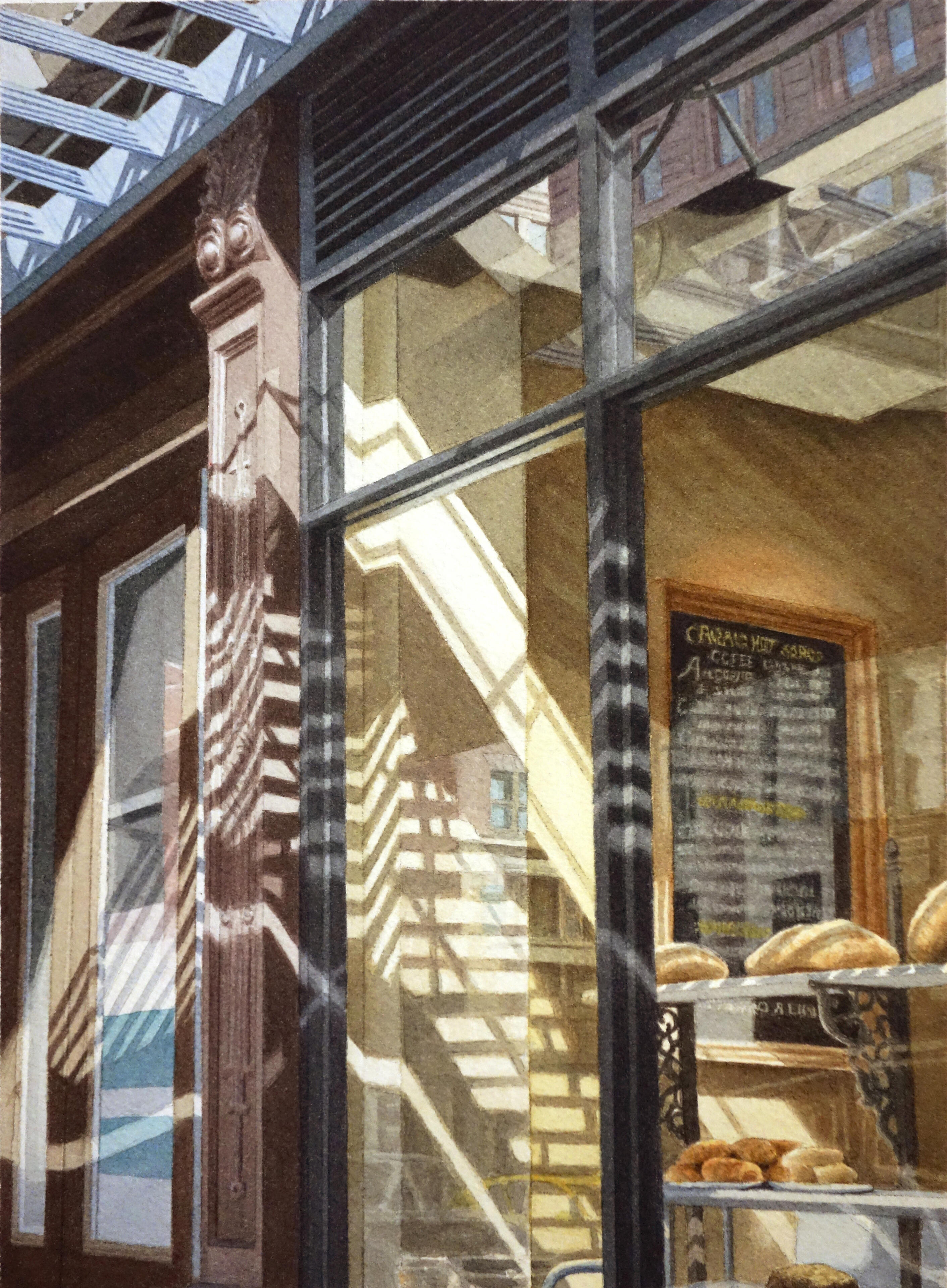 My work explores the overlooked beauty of urban life—architectural details, fleeting light patterns, reflections, and geometric forms that reveal deeper truths about existence and perception. I distill experience into its essential elements. The subjects I choose—architectural ornaments, geometric light patterns, window reflections, staircases—embody contradiction: abstract yet calculated, fleeting yet eternal, physical yet spiritual. These elements exist in beautiful balance, much like the watercolor medium itself.